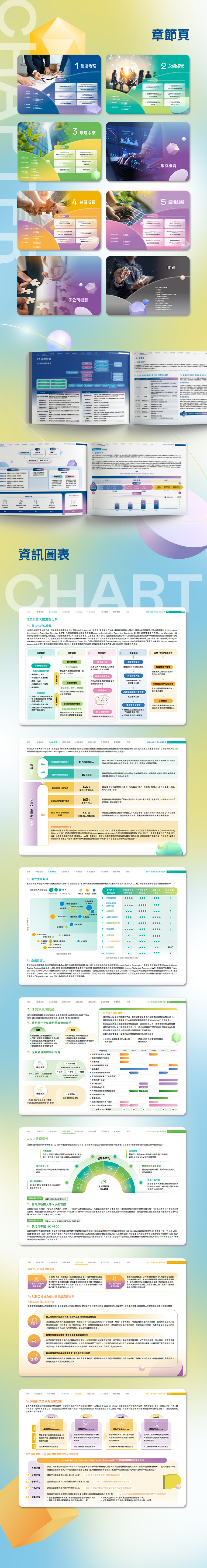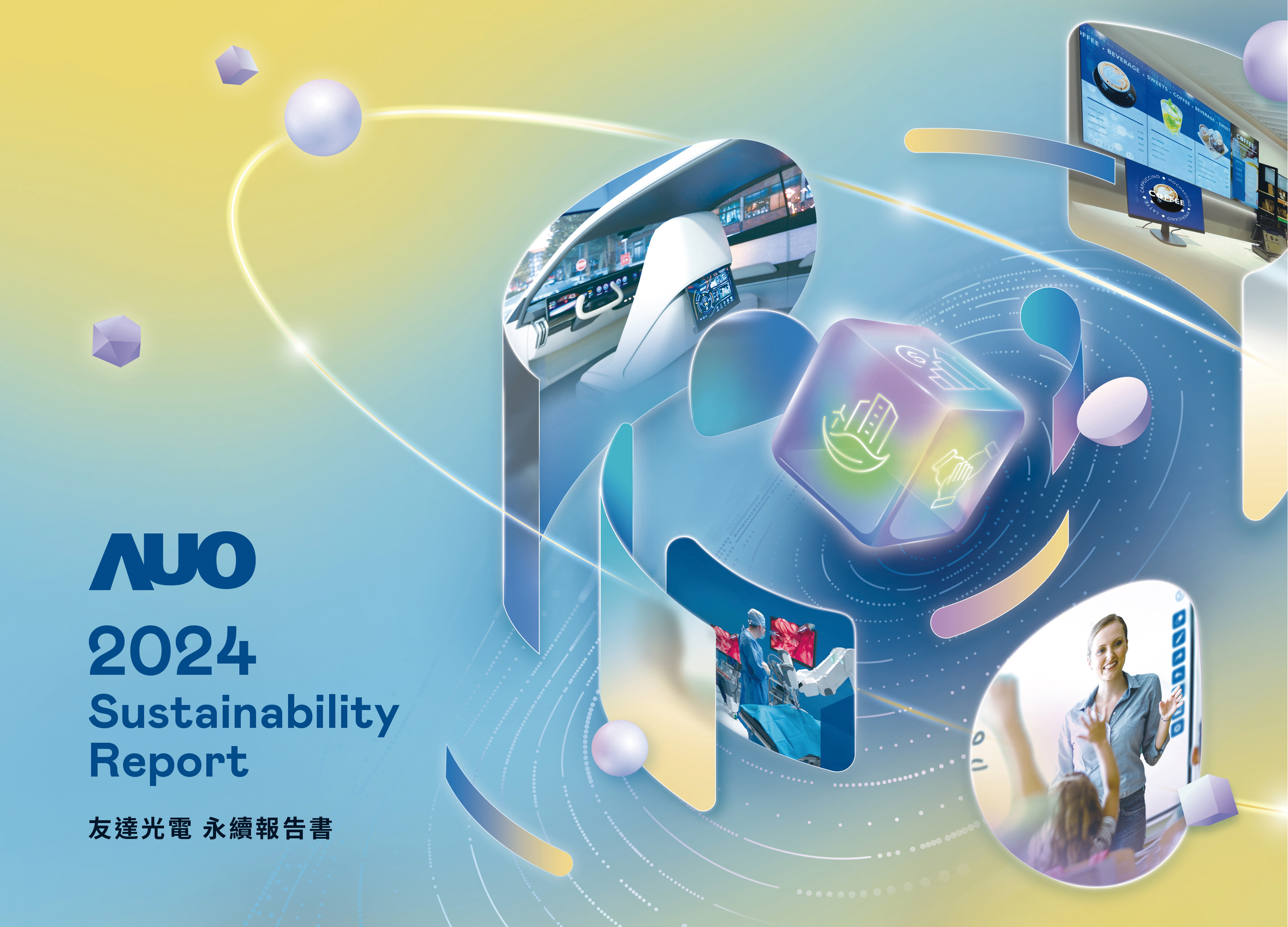 友達光電 2024 ESG 報告書以「顯示科技、智慧移動、垂直場域」為核心,不僅專注於顯示技術,針對各領域的挑戰與機會進行營運聚焦與優化,以取得最佳表現,達到穩定獲利、永續經營。封面設計圍繞ESG三大面向、面板技術及多元場域三大主軸展開,展現企業如何透過創新科技與永續行動推動產業進步與社會發展。運用幾何圖形象徵向外擴 散的結構,光影效果展現科技感與未來性,曲面元素則傳遞顯示技術的流暢與創新 。