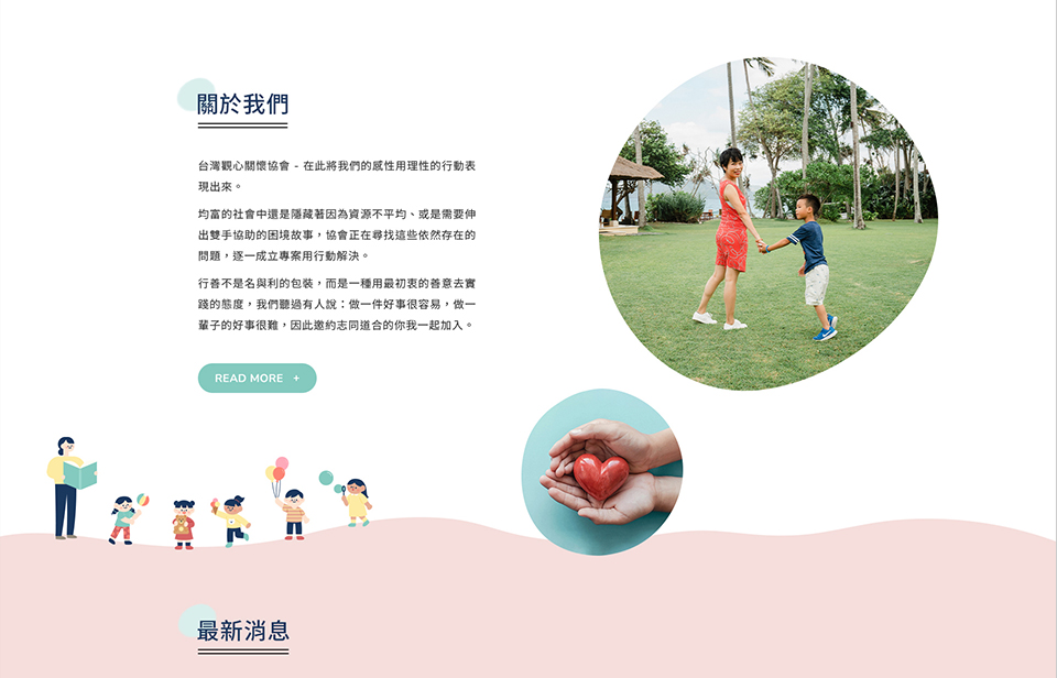 視覺設計以協會既有VI延伸,以圓潤造型與曲線元素,搭配柔和的品牌色系,並適時加入活潑的動態,營造出如同協會宗旨般溫柔、安定的力量。 -